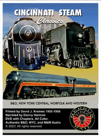 Filmed by David J Kreines on several visits in 1955-56, CINCINNATI STEAM CLASSICS takes you to the Queen City when New York Central and Baltimore and Ohio were still running steam locomotives on some of their passenger trains and Norfolk & Western was 100% steam. You'll find NYC Hudsons and Mohawks, B&O Pacifics in several classes, and N&W J class 4-8-4s. Trains include NYC "James Whitcomb Riley", "Queen City", "Chicago Express" and more plus B&O's "Cincinnati", "238" and others. N&W's "Cavalier" is found several times with the famous J class. Also, On May 5, 1956, a Ky Derby Special departed with L&N M1 class 2-8-4 1960, the only day L&N ever ran those trains with the M1s. In Part 2, you'll visit NYC Steam freight operations in Cincinnati with 4-8-2 Mohawks, 2-8-2 Mikados handling freight assignments, and 0-6-0 and 0-8-0 switchers working the three yards. Narrated by Danny Harmon. 64 minutes. All Color. Authentic sound. Narrated or Un-narrated viewing. Chapters. Previews of 5 other shows are included.
