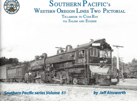 This b&w horizontal format book features SP steam locomotives in western Oregon, Tillamook to Coos Bay via Salem and Eugene; one large photo per page.