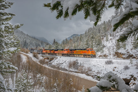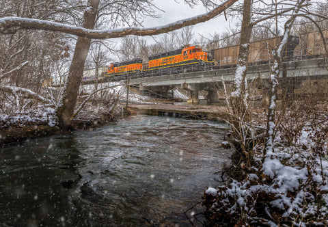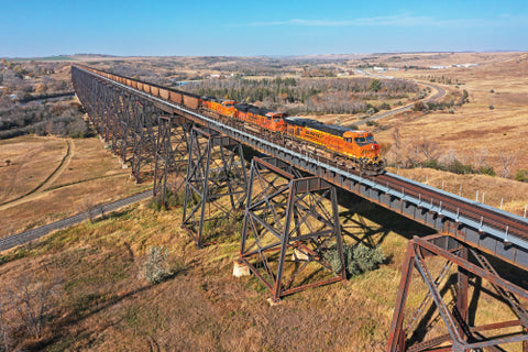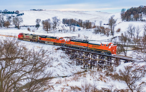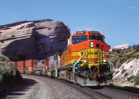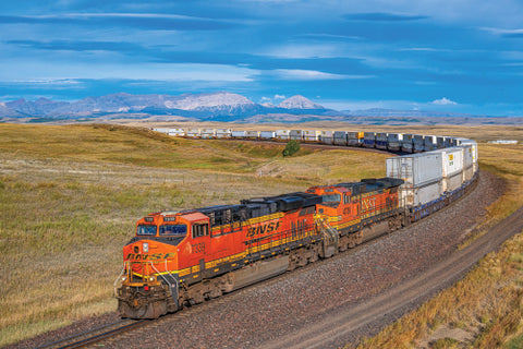 The 2026 BNSF Calendar features 13 large views of BNSF trains, one scene for each month from January 2026 through January 2027. The calendar opens to an eye-catching 14 x 19-1/2 inches. The calendar grid features number blocks suitable for note-taking.