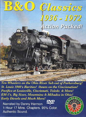 B&O action from 1936-1972. Narrated by Danny Harmon (view with or without narration). Chapter menu. This DVD Focuses on steam, first and second generation diesels at : Ohio River Sub (Parkersburg - Kenova line), St. Louis area, Louisville KY, North Vernon IN, Chicago (B&OCT), Toledo, Deshler, Willard, Lorain line, Akron, Cincinnati and more. Steam power includes 4-6-0s, 4-6-2s, 4-6-4 Lord Baltimore, 4-8-2s, 2-8-0s, 2-8-2s, 2-10-2s, EM-1 2-8-8-4s, 0-8-0s + Southern PS2 class 4-6-2s. Diesels: B&O 50, E units, F units, Geeps, Alcos.